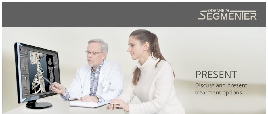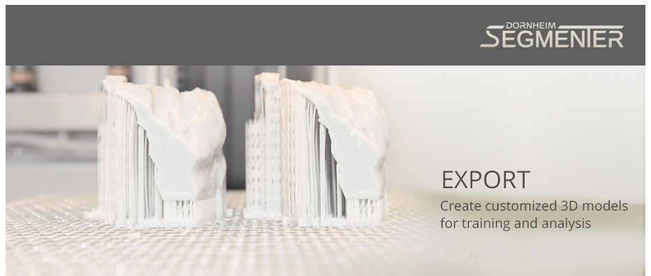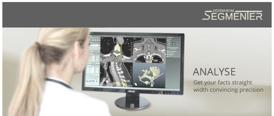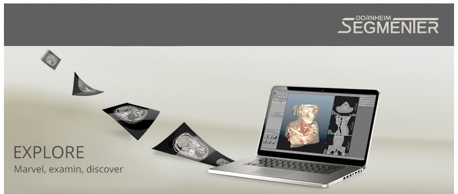 Dornheim Segmenter Viewer and Dornheim Segmenter Presenter are the best solutions if you want to explore DICOM and other volume data - not only per slice but also in 3D at all angles including the interior - with the known quality of the professional Dornheim Segmenter product family. The interactive measurement opportunities of the Dornheim Segmenter are also included. The Dornheim Segmenter Presenter offers an additional comprehensive multimedia export functionality and supports 3D displays and projectors.